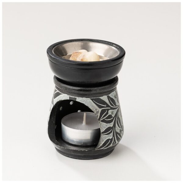 Ein Räucherstövchen aus fein strukturiertem Speckstein mit einer kleinen Schale. Diese Schale kannst du für Räuchermischungen und Harze ebenso wie für Duftöle verwenden.